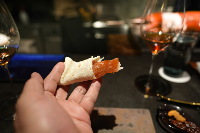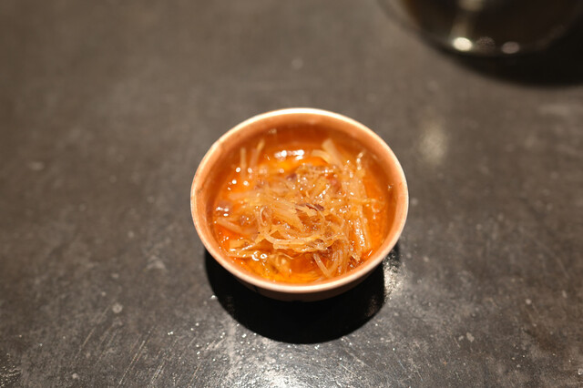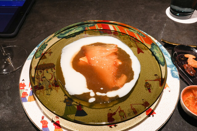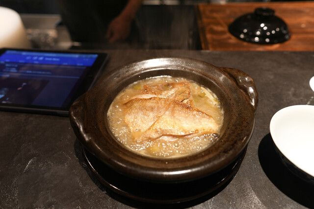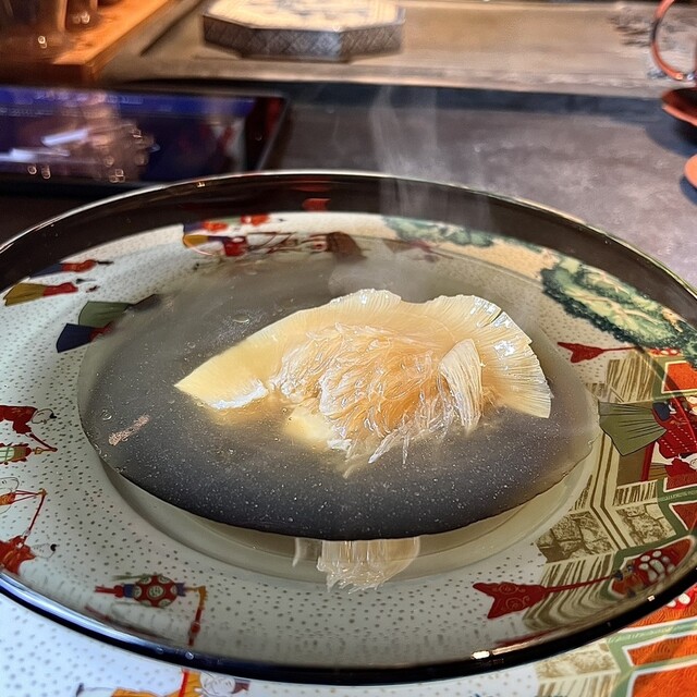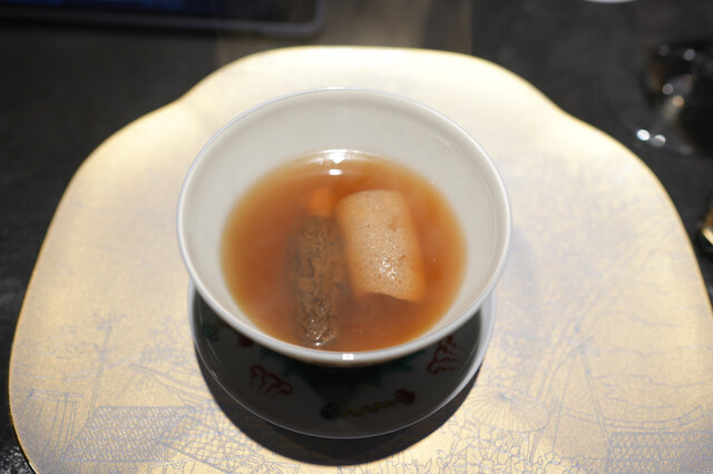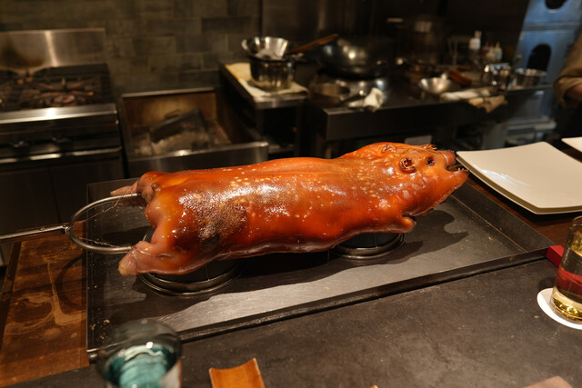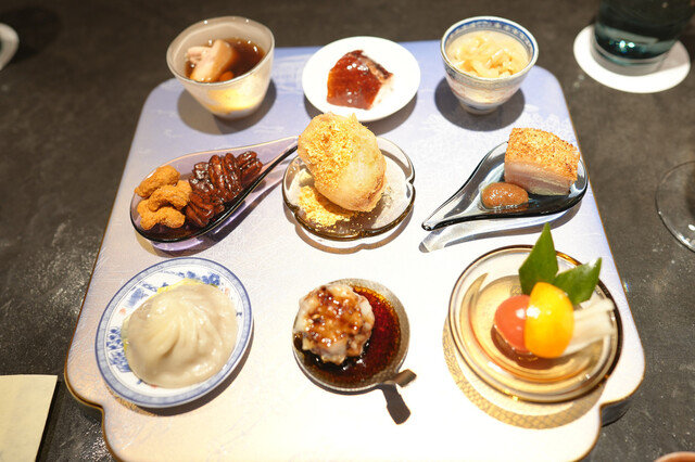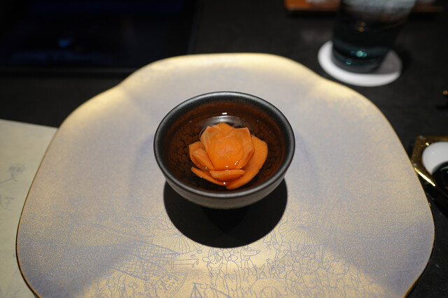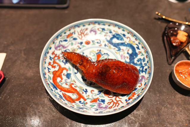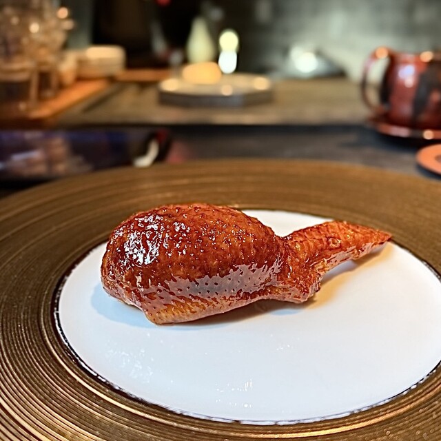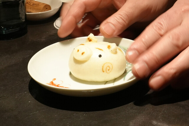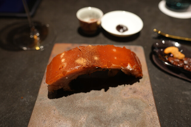 蒸し鮑と、1週間かけて戻す干し鮑を見事な陰陽模様のソースで供する名物「鮑の対極仕立て」。秋には上海蟹をたっぷりかけたフカヒレ姿煮。あるいはカウンターすぐ目の前では子豚を丸焼きにする。豪快至極なインパクトと、精緻・精密な完成度の料理で2019年秋の開店以来、またたく間にグルマンの話題を席捲した広東料理店。予約受付は毎・奇数月1日。受付け開始とともに即、席が埋まる人気は、日々高まる一方である。