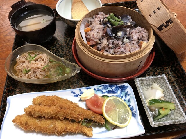 鰆西京焼き、丸なす田楽、蛤の吸い物、林檎のゼリー寄せ