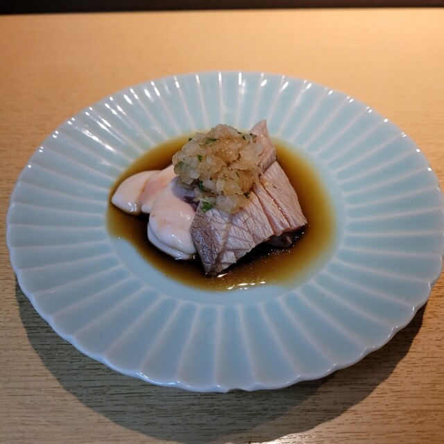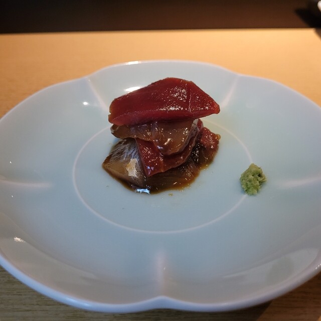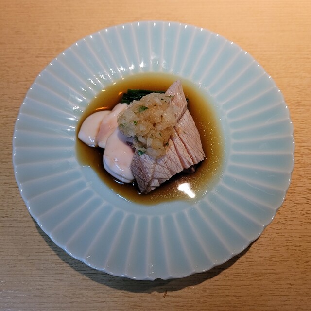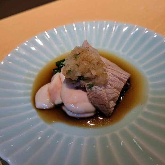 青森県大間産150kgの鮪の漬けと、富山ならではの鰤の子・ふくらぎの造りをミルフィーユ仕立てで、玉葱醤油とあわせて供されました。