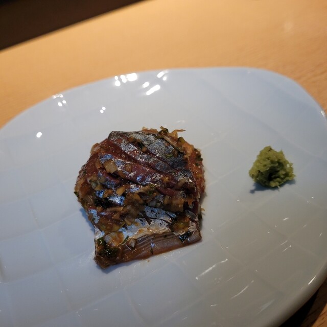 富山産の鯵、山の醤油と生姜、葱、大葉とともに、追い山葵で楽しませていただきました。