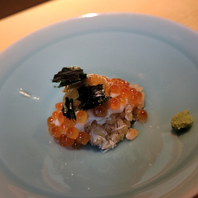 続いての小丼は一番出汁で仕上げたいくら、白子のムース、雲丹、蟹という贅沢な組み合わせの1品。