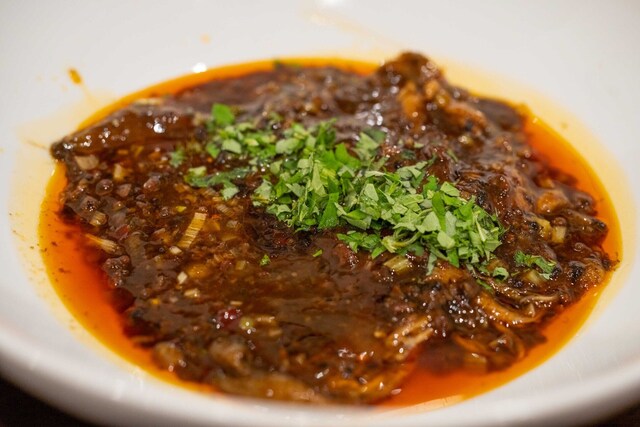 四川の濃厚な味付け、カワミドリの香りが、カスベを昇華させていました。