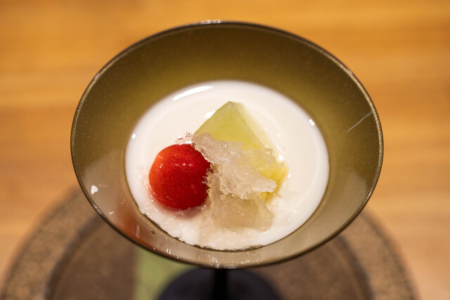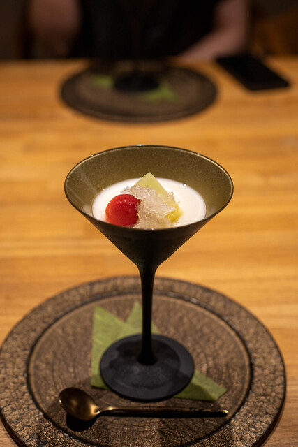 2023.6 自家製杏仁豆腐 鉾田産イバラキング(緑肉メロン)山形産佐藤錦(さくらんぼ)ツバメの巣のシロップ漬け