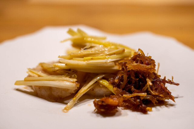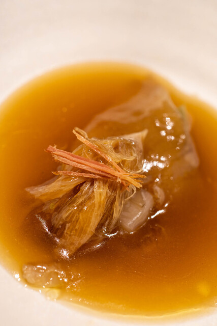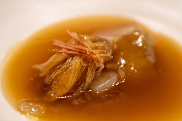 2023.6 フカヒレ2種盛り(台湾産ドラゴンフルーツの花、ヨシキリザメの尾ビレ、モウカザメの尾ビレ、ウバザメの頭部コラーゲン、削った金華火腿、金華火腿のスープ)