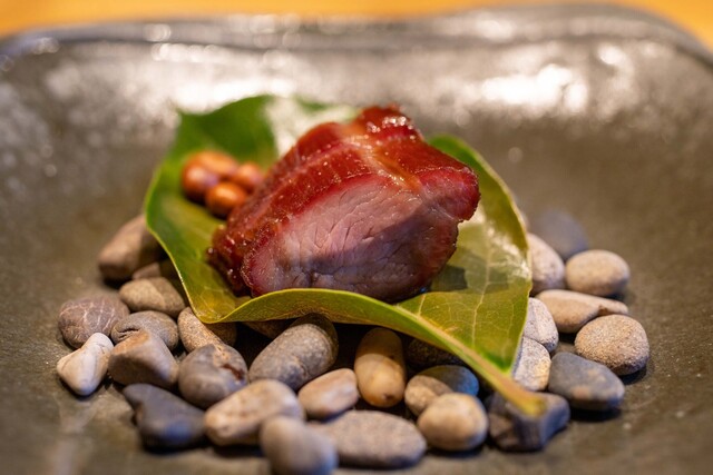 窯焼きの自家製チャーシューに落花生を添えており、焼け石を下に敷き詰めて保温しています。
