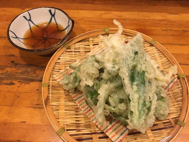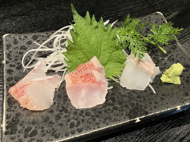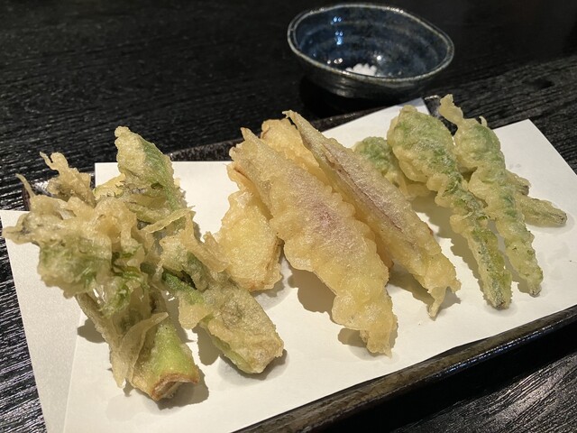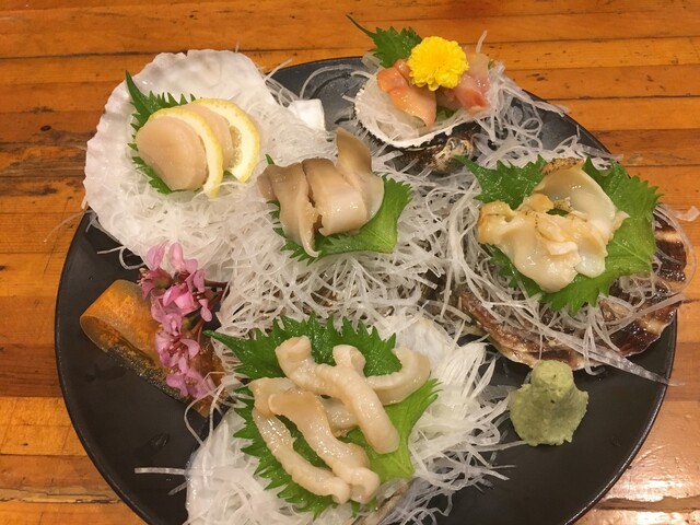 白身刺し3種、貝焼みそ、にしん焼、山菜天ぷら