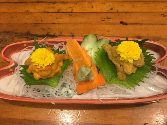 貝刺盛、うに刺盛、山菜天盛、生ハムサラダ 再訪