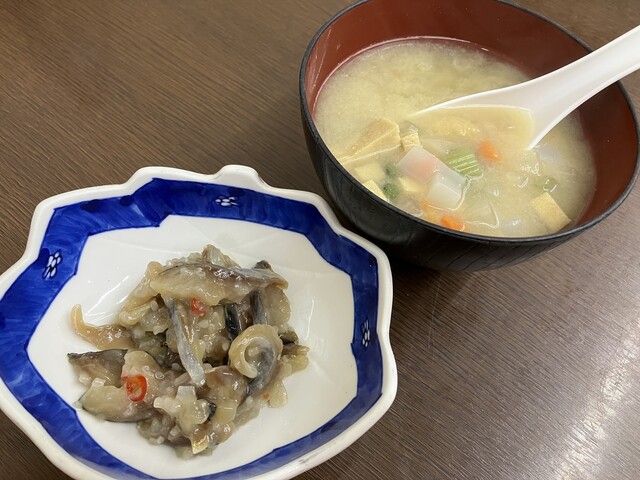 鰆西京焼き、丸なす田楽、蛤の吸い物、林檎のゼリー寄せ