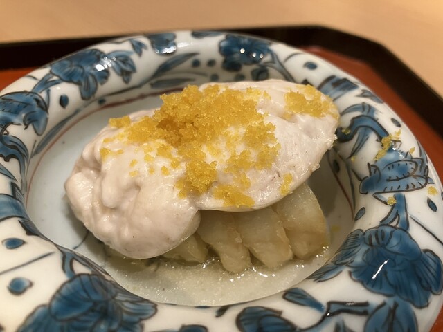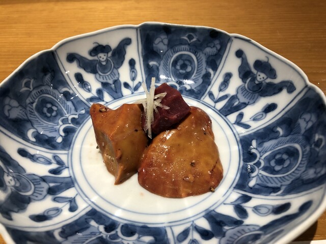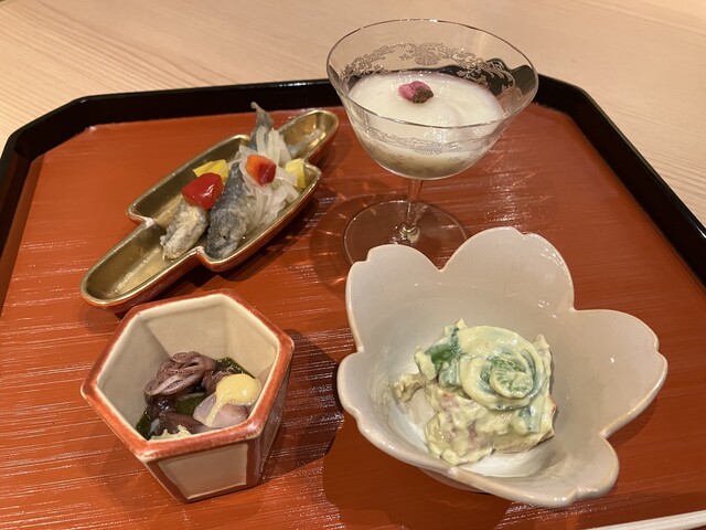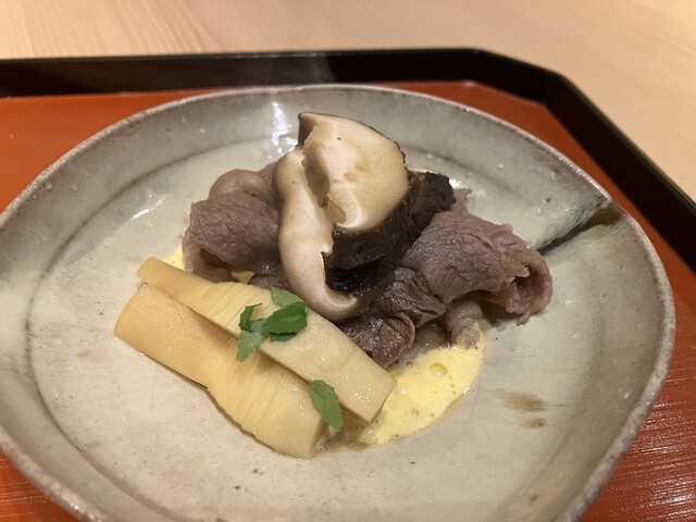 能登牛のすき焼き風、毛蟹とホワイトアスパラガスの擂り流し、スモークサーモンとコゴミのピスタチオ白和え、アイナメの揚げ出しとフグの焼き白子、赤貝造り 再訪