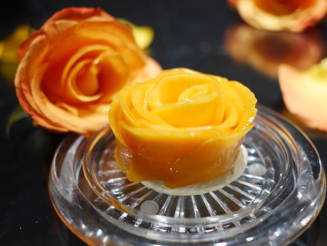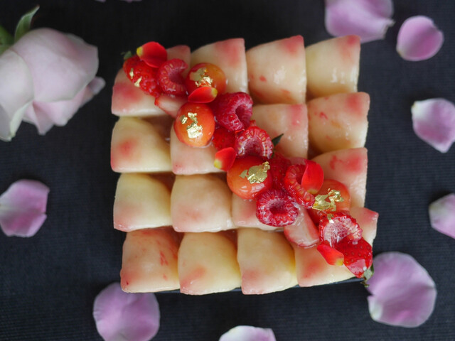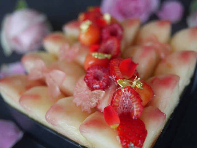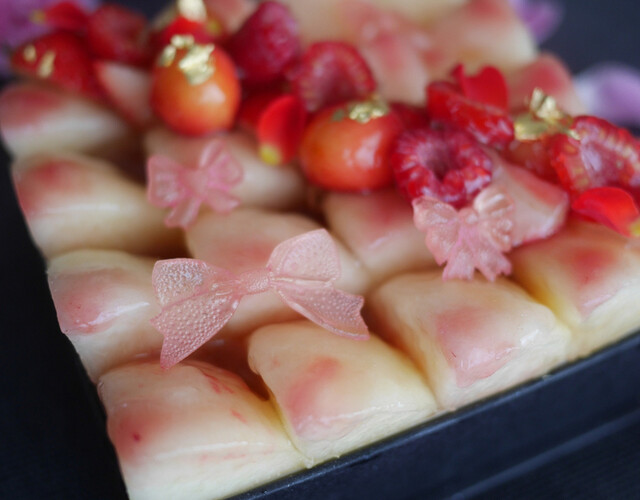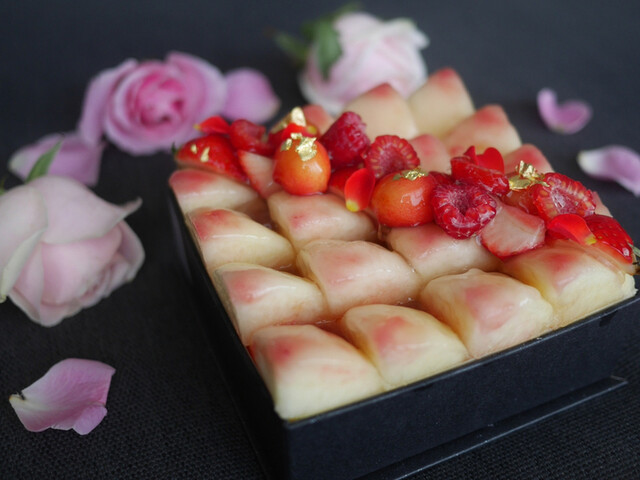 完璧に食べ頃に熟した桃と、優しい甘さのカスタードクリーム、サクサクのタルト生地。今年は新作ピンクのリボンの飴細工ですね。...
